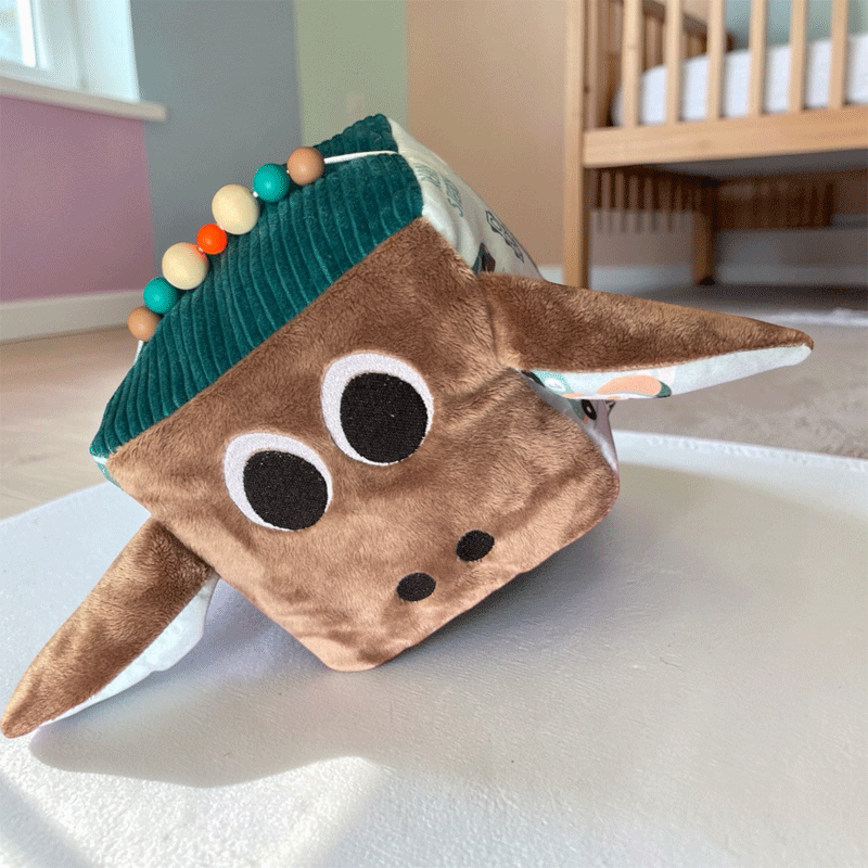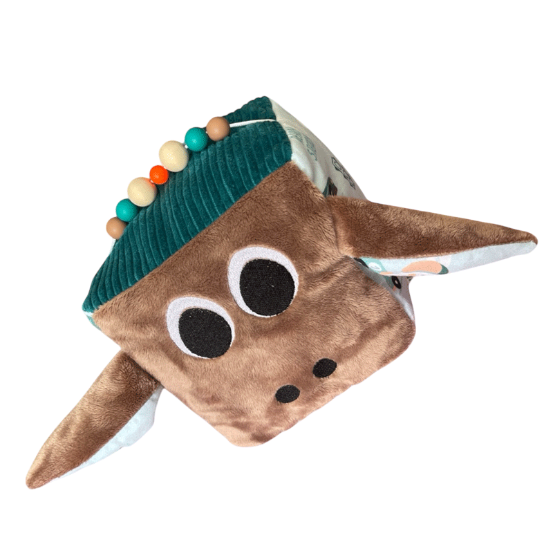 Offrez à votre bébé un univers de découvertes avec notre cube d’activités sensoriel avec toutes ces activités sonores et tactiles, entièrement fabriqué à la main en Franc