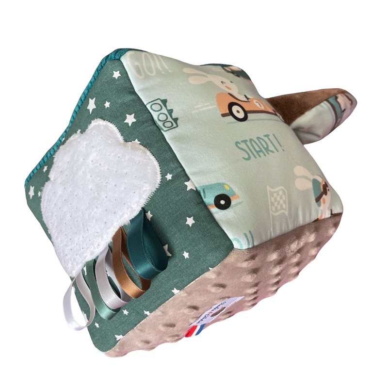 Offrez à votre bébé un univers de découvertes avec notre cube d'éveil avec toutes ces activités sonores et tactiles, entièrement fabriqué à la main en France. Ce jouet coloré et ludique avec ce joli motif voiture rétro est conçu pour stimuler tous les sens de votre enfant dès ses premiers mois.